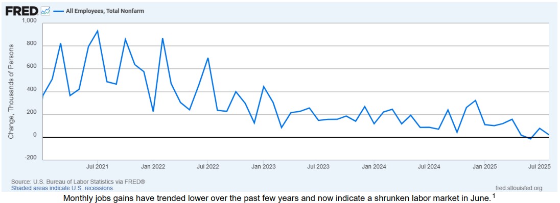 The current market consensus is that the Federal Reserve will lower the fed funds rate on September 17. The majority of committee members has communicated the belief that the risk of a softening labor market is a greater concern than the possibility of stoking inflation. While the unemployment rate remains low at 4.3%, recent nonfarm payroll reports and revisions have caught the attention of policy makers and investors. In the first payroll report since the head of the Bureau of Labor Statistics was fired, it was announced that only 22,000 jobs were added in August compared to the expected 75,000. Additionally, the June data was revised lower again and now reflects a reduction of 13,000 jobs, the first negative month since December 2020. The July jobs report was revised slightly higher. The Quarterly Census of Employment and Wages (QCEW) released on September 9 estimated that 911,000 fewer jobs were created during the year prior to March 2025 than previously announced, providing additional evidence of a softening labor market. The revision was on the high end of the expected range and represents the largest percentage negative revision since the global financial crisis. The revision is subject to an update in March 2026. Last year’s similarly large negative initial QCEW revision of 818,000 was subsequently adjusted to a still-sizable 598,000.